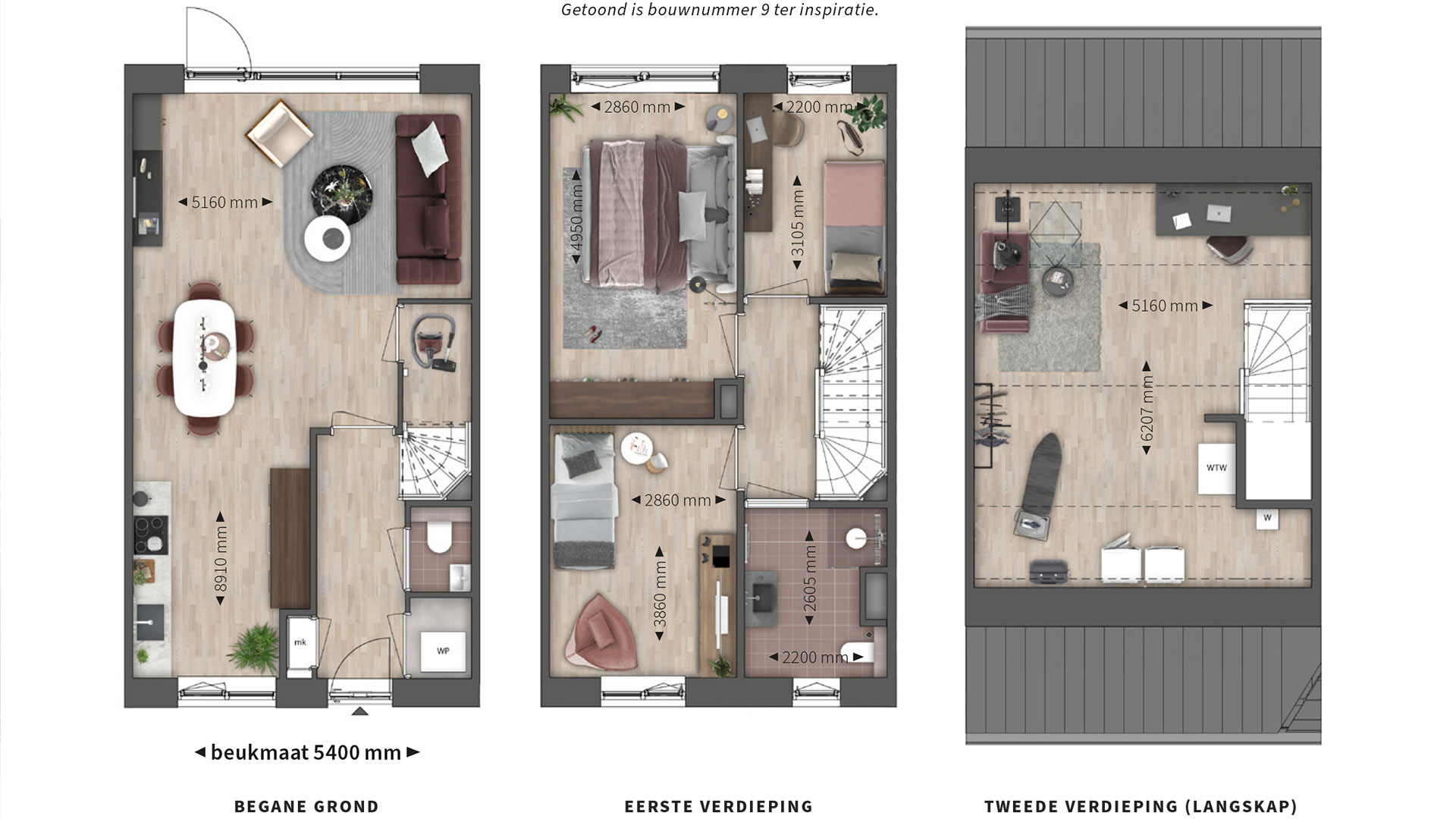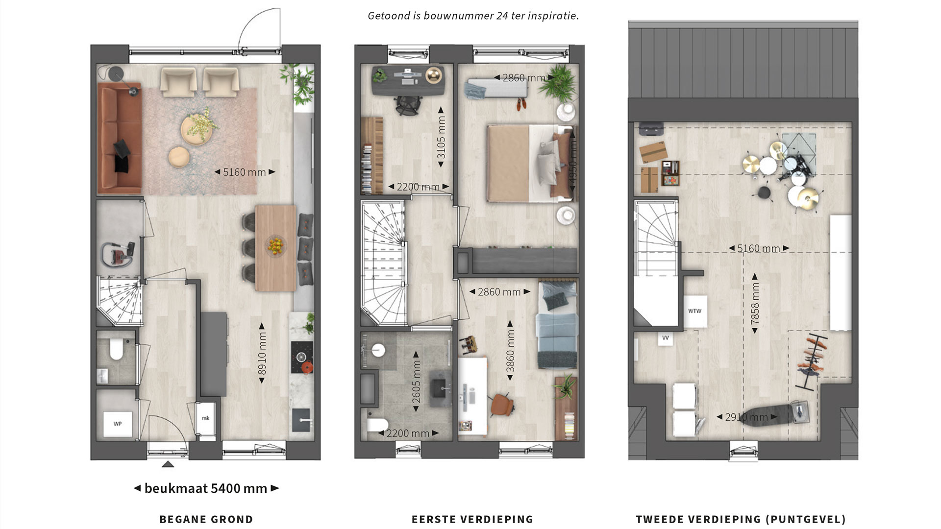 De artist impressie van het interieur geeft slechts een indicatie van de mogelijke invulling. Voor de exacte afmetingen en details van de woningen verwijzen wij u door naar de verkooptekeningen. Gevels en raamindelingen kunnen afwijken.